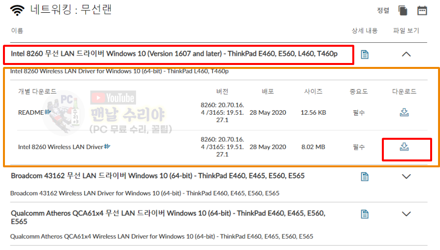 (6) 해당 드라이버를 클릭하면, 아래와 같이 [실제 다운로드 파일]이 펼쳐지는데,