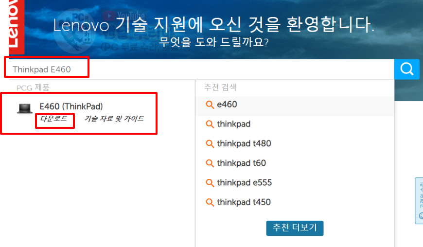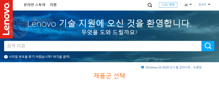 2) 그 다음, [검색 지원] 부분에 자신의 레노버 PC 모델명이나 시리얼 번호를 입력한다