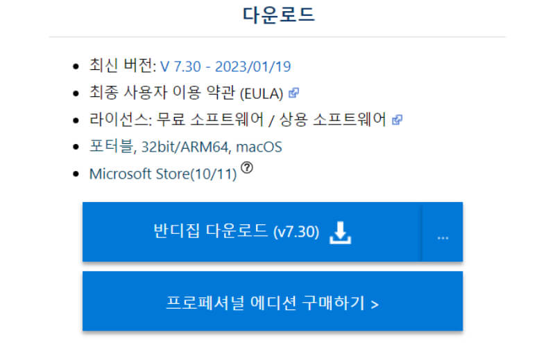 ② 화면에 있는 반디집 for Windows 또는 for macOS 중 본인이 사용하는 운영체제를 선택합니다.