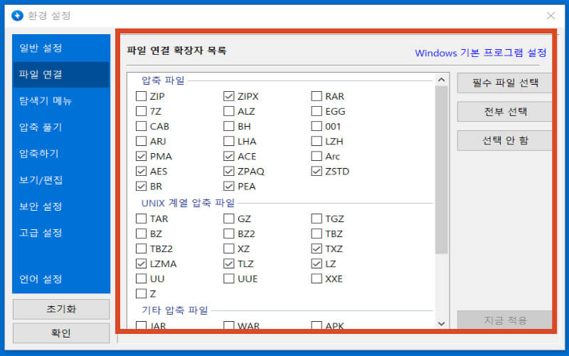 ⑤ 이제 반디집을 실행하여 설정에 들어가셔서 본인이 원하는 압축 형식을 클릭합니다.