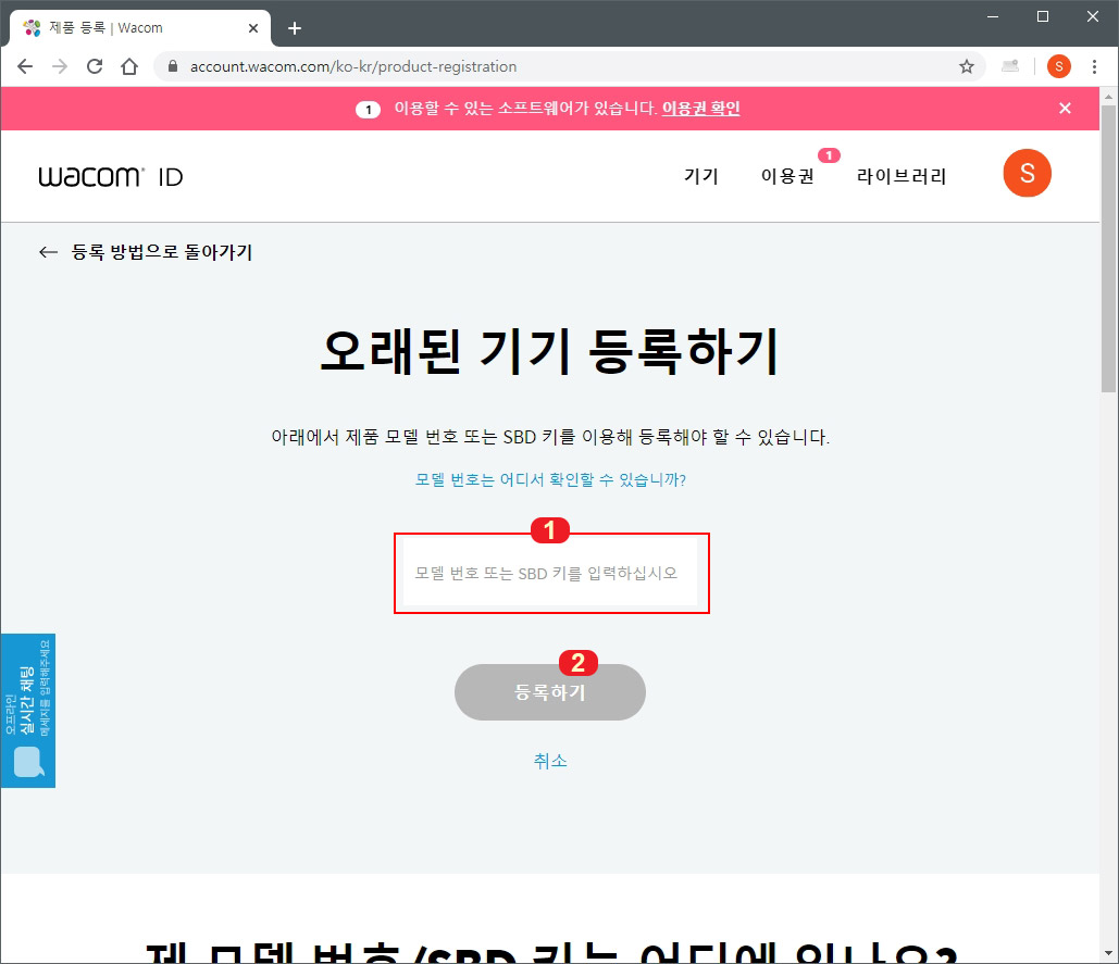 7. 구매하신 와콤 타블렛의 모델 번호나 SBD 번호를 입력해 줍니다. CTL-6100wl 같은 모델 번호를 입력하신 후 등록하기 버튼을 누르면 기기가 등록됩니다. 아니면 아래의 방법으로 모델 번호나 SBD 키를 확인하실 수 있습니다.