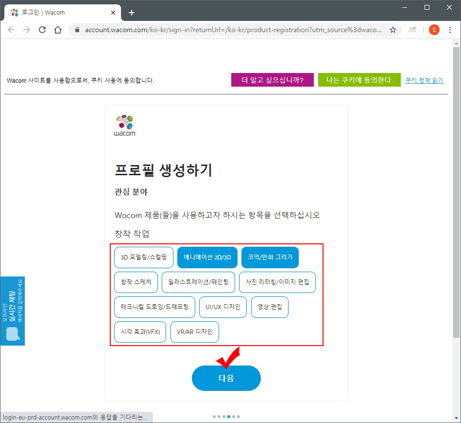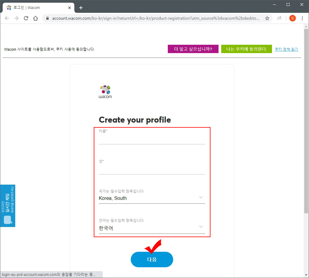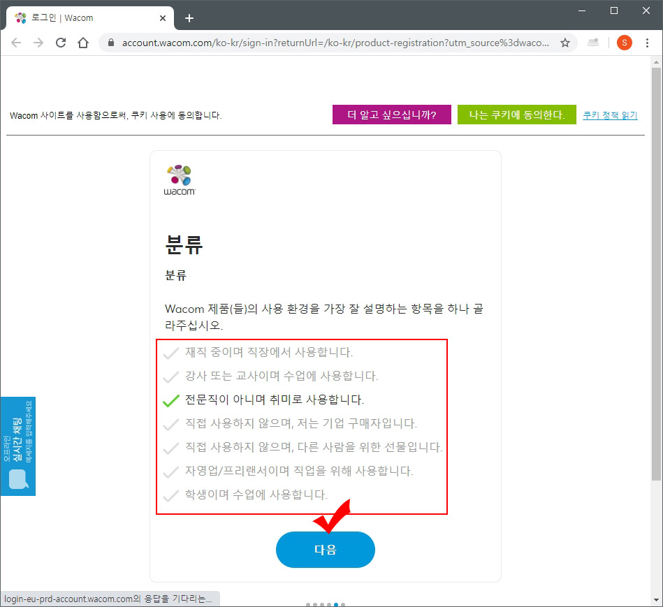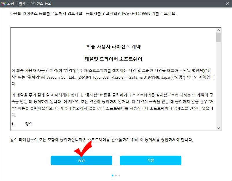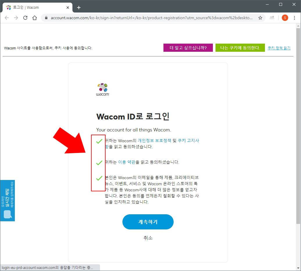 12. 와콤 약관 동의에 체크하시고 "계속하기" 버튼을 눌러 줍니다.