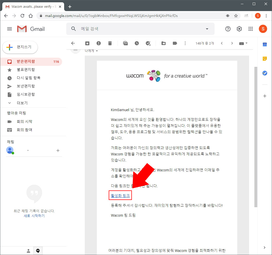 16. 와콤에서 온 메일을 열어보면 "활성화 링크" 버튼이 나오는데 클릭하시면 와콤 사이트에 내 기기가 등록됩니다.