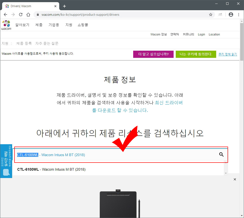 1. 와콤 드라이버 다운로드 사이트로 들어가면 검색창이 뜹니다. 여기에 본인이 구매하신 타블렛의 모델명을 입력하고 검색해 줍니다. 저는 CTL-6100WL 드라이버를 설치하려고 합니다.