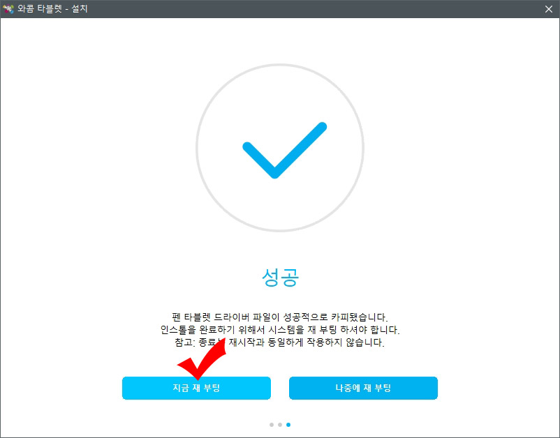6. 설치가 완료되면 재부팅하라는 메시지가 뜹니다. "지금 재 부팅"을 눌러 컴퓨터를 다시 시작해 줍니다.