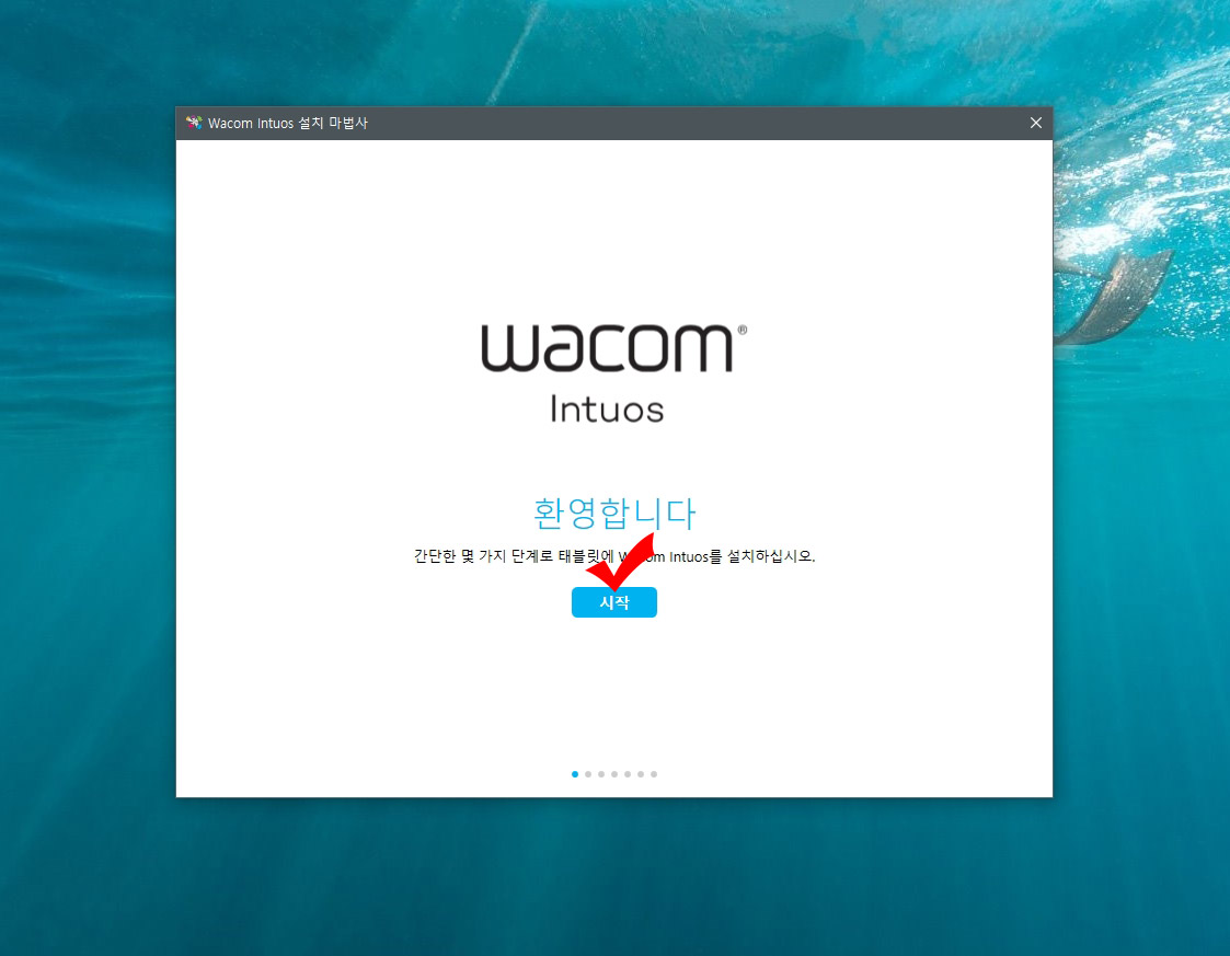 7. 컴퓨터 재부팅이 되면 와콤 인튜어스 환영 팝업이 뜹니다. 시작 버튼을 눌러 다음으로 진행해 줍니다.