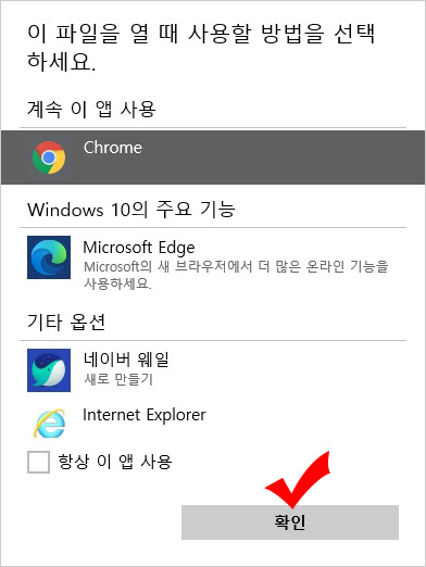 10. 등록 버튼을 누르면 파일을 열 때 사용할 앱 선택 화면이 나오는데 기존 사용하던 웹 브라우저나 인터넷 브라우저 아무거나 선택하시면 됩니다.
