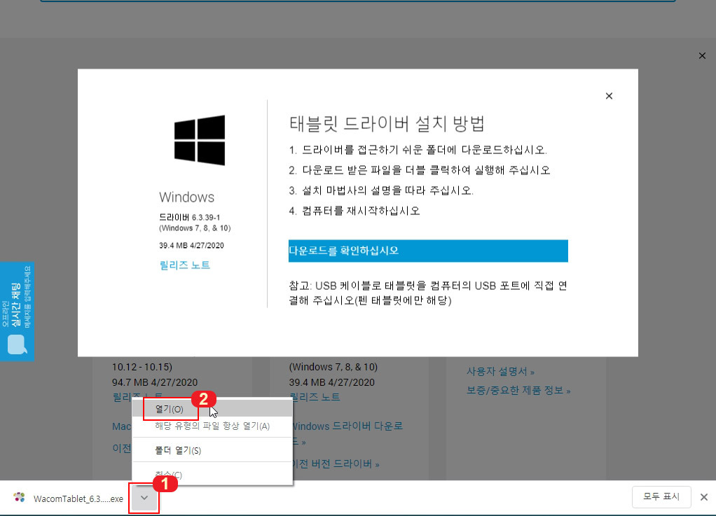 3. 다운로드 버튼을 누르면 설치 방법 화면이 나오고 파일이 다운로드됩니다. 다운로드된 드라이버를 열어서 실행시켜 줍니다.