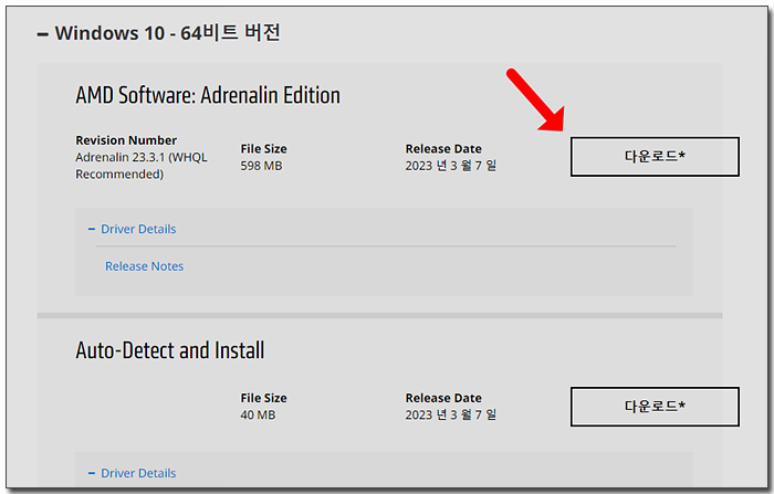 AMD Software 버전을 확인하시고 다운로드 아이콘을 클릭하여 드라이버를 다운로드 해주시면 됩니다.