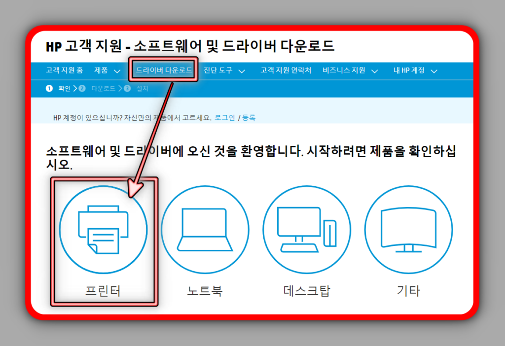 2) hp 프린터 드라이버 다운로드 설치 이동하기