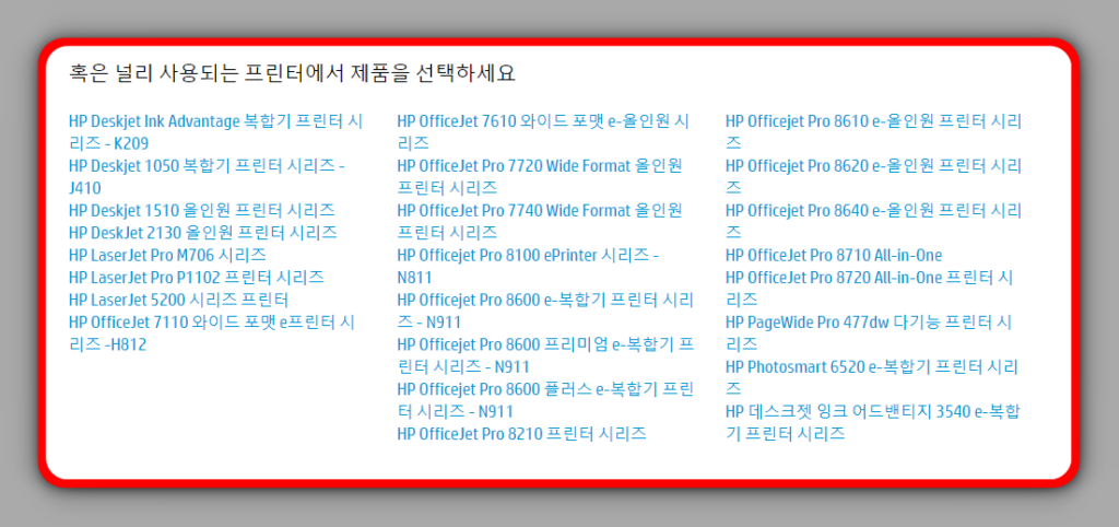hp 프린터 드라이버 다운로드를 자주 찾는 제품은 검색하는 화면 아래를 참고하면 됩니다.
